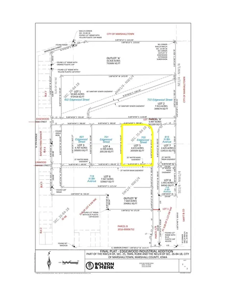 Lot 5:This is an industrial building lot that offers great potential for commercial ventures. Situated in a prime location, this lot provides ample space for establishing an industrial facility. With a sizeable area and convenient access, it presents an excellent opportunity for various industrial operations. Its strategic position makes it an ideal choice for businesses seeking a centralized location. This building lot is poised to accommodate the needs of diverse industries, making it a promising investment for those seeking to establish or expand their industrial ventures. These lots have been designed so the City of Marshalltown's storm water detention requirement is met off-site through a City installed, owned, and maintained storm water regional retention basin. The City's requirements for storm water detention, will not be required on these lots. Additional information provided upon request.