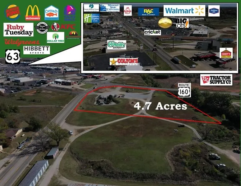 Welcome to an exceptional opportunity in the heart of West Plains' thriving retail district! This prime commercial property, situated prominently at the corner of West Highway 160 and County Road 6070, offers a strategic location that's second to none. Boasting a sprawling 4.7 acres of potential, this versatile property is brimming with possibilities.