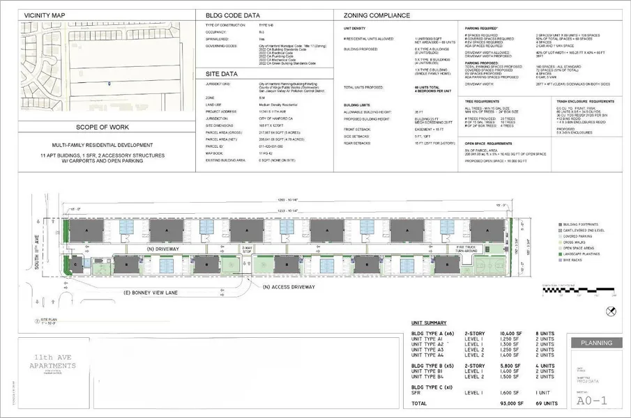 Rare multi-family development opportunity in Hanford! This 4.78-acre parcel at 11741 S. 11th Avenue, Hanford, CA 93230 offers an opportunity to resubmit for a multiple unit Tentative Tract Map for a thoughtfully planned community of 69 total units: six 8-plex buildings, five 4-plex buildings, and one single-family residence all designed with four-bedroom layouts to meet strong rental demand. The project integrates modern multi-family features including 140 total parking spaces (with 72 covered, ADA, and EV charging stalls), landscaped open space exceeding city requirements, children's play areas, a basketball court, and shaded pergola seating, creating a highly livable environment attractive to future tenants. With zoning in place (R-M Medium Density Residential) and approval through the City of Hanford Planning Department, developers can immediately move forward on a turnkey build, saving months, even years of approval time. Positioned minutes from schools, retail, and Highway 198 access, the site combines small-city convenience with strong long-term growth potential, making it an ideal acquisition for builders, experienced investors, or small funds seeking scalable housing inventory in California's Central Valley.