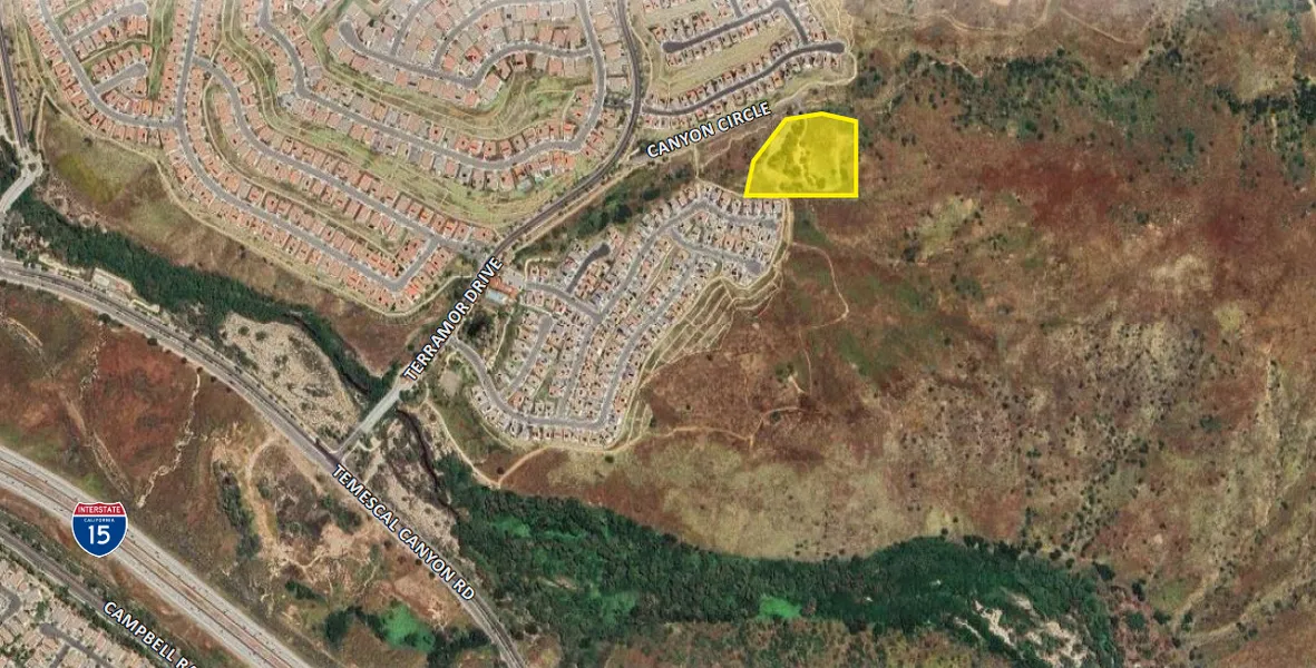 The subject property consists of two legal parcels totaling 4.8 acres of undeveloped land adjacent to the Terramor master planned community in Temescal Valley. The site is located on Canyon Circle, which is a private road (gated & paved) accessible via Terramor Drive, and has existing water and sewer mains available for hookup. In preliminary conversations with the Riverside County Planning Department, they have indicated a small subdivision consisting of 12-15 homes would be supported, although you may be able to go outside that range as long as your plan is consistent with the MDR land use. Any homes developed on the property can utilize the amenities within the Terramor community by paying community fees. Please reach out to a member of our team with any questions or interest regarding this opportunity.