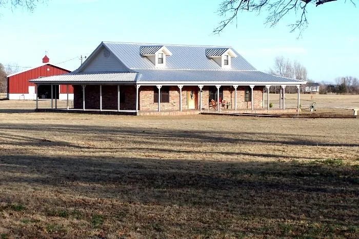 Just outside of De Leon on CR 445: The home on this property is a 2004 built, all custom Texas Style 2 bedroom, 2 bath brick home with 1500 sq. ft. living area (CAD), and central air/heat. The open concept living area has vaulted ceilings, a roomy den, a spacious kitchen with an island Jennair cooktop, recessed lighting and Corian countertops. The master suite is large, and the bath includes tile countertops and a garden tub and walk in shower. The home has a metal roof, and the exterior is encompassed by a covered porch which extends around the home on all sides. The attached and covered 2 car parking bay includes a large storage area, and has a cement floor.