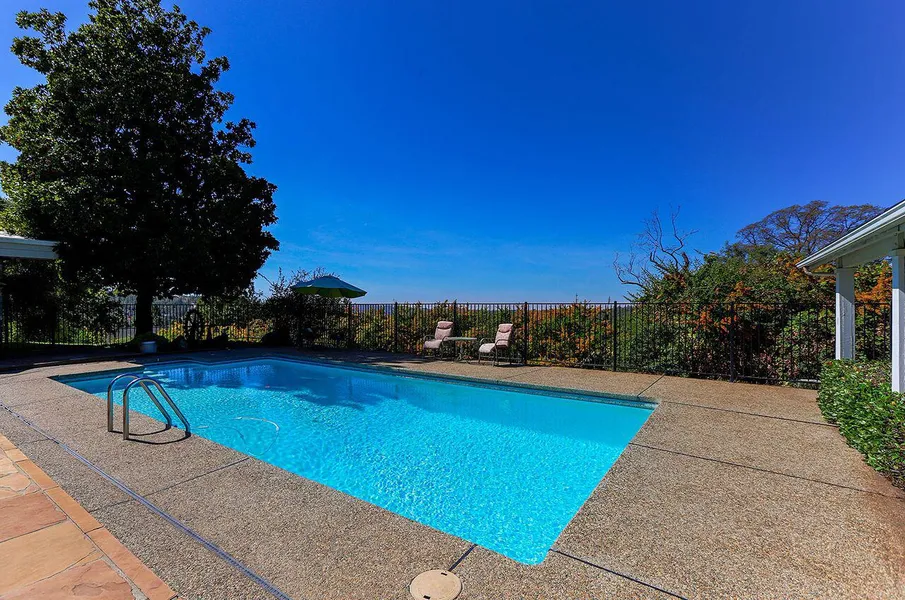 Custom built mid century modern architectural gem with views! Incredible entertaining home with vaulted ceilings, wall of glass, stone details, in ground pool, large chefs kitchen with butler pantry. Guest cottage is an additional 1/1 approx. 600 sqft. 2 car carport between the units and a detached 4+ car garage/shop. Low maintenance, mature landscaping, pond and even a horse pasture which could be irrigated with NID. All this tucked away on a knoll in a small gated subdivision. Pond is shared. Sunsets are stunning!
