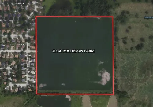 The Matteson Farm offers a unique 40-acre parcel located in Rich Township, Cook County, Illinois. This tract features strong agricultural soils with a weighted average PI of 122.2, making it well-suited for corn and soybean production. The land also includes wetland areas, floodplain zones, and high-visibility frontage near Matteson, IL, providing potential for development, conservation programs, or recreational use.