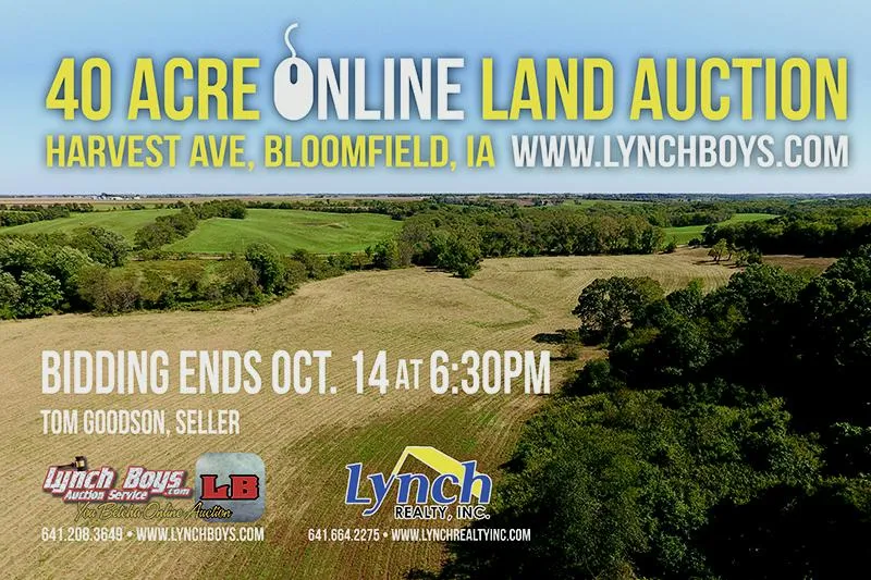 ONLINE ONLY bidding download the "lynchboys" app on your smartphone device or go to lynchboys dot com to submit your bids!! 40 Acres of Bottom and Timber ground. Creek runs through on the NE corner. Pond on the West. Land has sit idle for 15+ years perfect for Organic production. Approx 24 Acres with 78 CSR. Nice Timber on the Southwest. Would also work for recreation land with an income. This farm is being sold price per acre times 40 the final bid price will be multiplied times 40 to reach a final dollar figure, Seller retains the righs to reject any and all bids, possession will be givin at closing on or before November 14th 2016. 10% will be due down within 24 hours of the close of the auction to Lynch Realty Inc. trust account. There has been potential interest for 2017 cash lease if interested parties would like more details please call auction company.Taxes will be prorated to date of closing