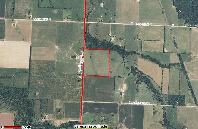 40 acres located south of Weaubleau on Hwy 123 in Hickory Co. 38 acres tillable rented for $125/acre. Asking $2500/acre.