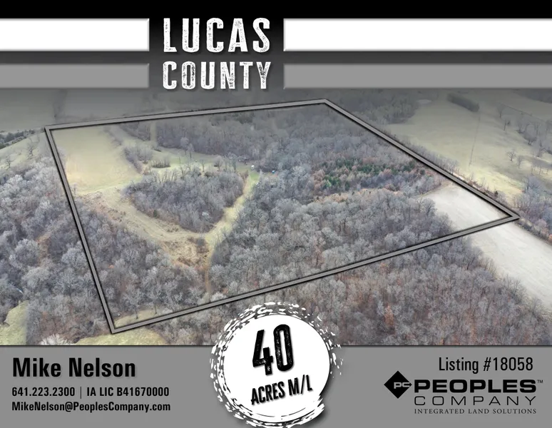 Hard to find 40 m/l acre farm in Lucas County, Iowa. This farm features big hardwood timber, thick brushy areas, and 4 m/l acres in crops and hay production. This farm is located in a game rich area full of turkeys and deer. The property is being sold "As Is", all personal property and old buildings will remain with the property.