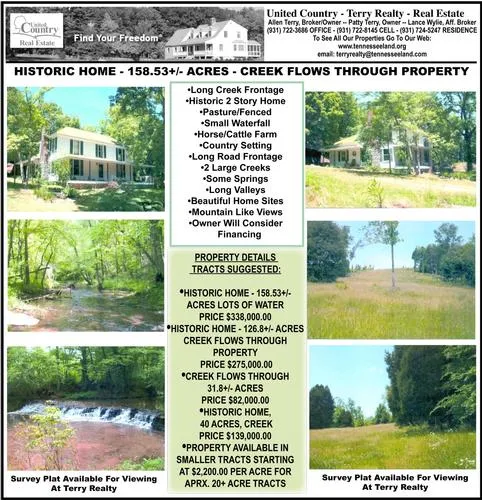 MOTIVATED SELLERS, PRICE REDUCED BY $78,000! NOW priced at $338,000.00 for all 158+ acres and home (LISTING#41099-20820). The historic home built in 1927 is said to a Sears and Roebuck home. It is 2 Stories with 2,088 square feet~ 1,464 square feet on the main floor and 624 square feet upstairs. The interior needs lots of work however. Board walls & ceilings in some rooms, wood floors, 3 bedrooms, 1 bath, good size dining room,sunroom & wrap around porch. New survey, the land is on both sides of a county gravel road not traveled much with an abundance of water flowing through! The house side features approximately 126 acres with Bowstring Branch flowing along the property line with waterfalls and some of the valleys have spring fed streams in them as well, nice spots to build ponds/lakes. It has rolling pasture, some of the land is also in cutover timberlands ready to easily clear off and plant in pasture or more trees, some not cut and a lot of fencing. Across the road Bowstring Branch flows through the remaining property and the property on that side is all fenced AND fronts also on another larger creek as well! Long road frontage, long creek frontages, beautiful farm. Seller is willing to divide as well. SUCH AS: LISTING #41099-20821-For $275,000.00. The historic home with apx. 126.8+/- acres, all on one side of the road, lots of pasture, some in the cut over timberlands, fencing and rock bottom Bowstring Branch flows along the border with waterfalls and some valleys with spring fed streams coming out of them. Long creek frontage, long county road frontage. OR THIS PARTICULAR #41099-20822-For $139,000.00 Historical home on 40+/- aces with some of the Bowstring Creek, mostly in pastureland with some timber and some fencing and a spring. OR #41099-30823-For $82,000.00 31.8+/- mostly level acres across the road from the home, with Bowstring Branch flowing through AND a second larger creek as well along one of the borders! Fenced, with beautiful level pasture & electric available. Long road frontage and creek frontages. OR Will Divide into even smaller tracts as little as apx. 7 acres in one spot for $2,200.00 per acre, with short frontage on a small creek and road frontage on the county road. OR SUCH AS LISTING: # 41099-20824 Will divide into 20+ acre tracts along the beautiful Bowstring Branch Creek with solid rock bottom and waterfalls with privacy and seclusion for $2,200.00 per acre. Owner will consider some owner financing, he said make a reasonable offer of what you can do and we'll consider it and go from there and see if we can work something out....
