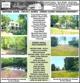 MOTIVATED SELLERS, PRICE REDUCED BY $78,000! NOW priced at $338,000.00 for all 158+ acres and home (LISTING#41099-20820). The historic home built in 1927 is said to a Sears and Roebuck home. It is 2 Stories with 2,088 square feet~ 1,464 square feet on the main floor and 624 square feet upstairs. The interior needs lots of work however. Board walls & ceilings in some rooms, wood floors, 3 bedrooms, 1 bath, good size dining room,sunroom & wrap around porch. New survey, the land is on both sides of a county gravel road not traveled much with an abundance of water flowing through! The house side features approximately 126 acres with Bowstring Branch flowing along the property line with waterfalls and some of the valleys have spring fed streams in them as well, nice spots to build ponds/lakes. It has rolling pasture, some of the land is also in cutover timberlands ready to easily clear off and plant in pasture or more trees, some not cut and a lot of fencing. Across the road Bowstring Branch flows through the remaining property and the property on that side is all fenced AND fronts also on another larger creek as well! Long road frontage, long creek frontages, beautiful farm. Seller is willing to divide as well. SUCH AS: #41099-20821-For $275,000.00. The historic home with apx. 126.8+/- acres, all on one side of the road, lots of pasture, some in the cut over timberlands, fencing and rock bottom Bowstring Branch flows along the border with waterfalls and some valleys with spring fed streams coming out of them. Long creek frontage, long county road frontage. OR #41099-20822-For $139,000.00 Historical home on 40+/- aces with some of the creek, mostly in pastureland with some timber and some fencing. OR THIS PARTICULAR LISTING #41099-30823-For $82,000.00 31.8+/- mostly level acres across the road from the home, with Bowstring Branch flowing through AND a second larger creek as well along one of the borders! Fenced, with beautiful level pasture & electric available. Long road frontage and creek frontages. OR Will Divide into even smaller tracts as little as apx. 7 acres in one spot for $2,200.00 per acre, with short frontage on a small creek and road frontage on the county road. OR SUCH AS LISTING: # 41099-20824 Will divide into 20+ acre tracts along the beautiful Bowstring Branch Creek with solid rock bottom and waterfalls with privacy and seclusion for $2,200.00 per acre. Owner will consider some owner financing, he said make a reasonable offer of what you can do and we'll consider it and go from there and see if we can work something out....