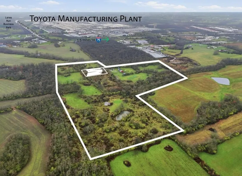 A noteworthy opportunity for investors and developers for over 40 acres of land situated near Toyota Motor Manufacturing and I-75 in Georgetown. The property is currently zoned A-1, with 13 acres within the Georgetown-Scott County Comprehensive Plan FLU, indicating a potential zone change for Industrial Use. The properties situated to the south and west are designated as I-1 and are incorporated within the Georgetown municipal boundaries. Prime real estate in a prime location, offering endless possibilities, and conveniently located off Cherry Blossom Way, just 1.5 miles from 1-75. Nearby businesses include Toyota Motor Manufacturing (currently employing over 9,500), Aichi Forge, ORBIS, and Lanes Run Business Park. Consistently recognized as one of Kentucky's fastest-growing markets, Georgetown continues to experience ongoing expansion across all sectors. This property's strategic location is conducive to growth and business success. Its prime position facilitates convenient access to essential services, transportation networks, and valuable business resources, thereby fostering an environment in which enterprises can flourish.