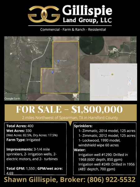 Improvements: 3- mile sprinklers, 2 irrigation wells, 2- electric motors, 2 turbine