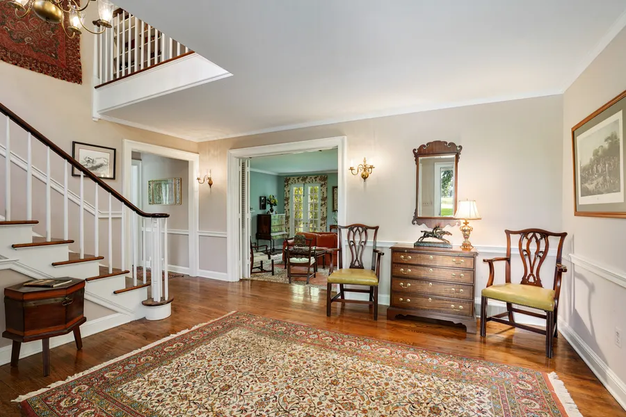As you enter the home, you are instantly welcomed by a grand foyer with a turned staircase and beautiful hardwood floors.