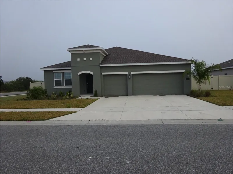 Short Sale. This property was built in 2023. It offers 2280 heated sq. ft, 4 bedrooms plus a den, 2 baths and a 3-car garage. The home sits on a large corner lot of .26 acre. The property is completely fenced in with no backyard neighbor. The large lot offers a superb water view of the pond day or night. The home itself offers an open floor split plan with tile floors throughout and carpet in the bedrooms. The kitchen has quartz countertops, an island with water and electricity, plenty of counter and cabinetry. Adjacent to the kitchen is a large walk-in pantry and laundry room. All kitchen appliance stays. Amenities include swimming pool, cabana, playground and dog park. Must see.