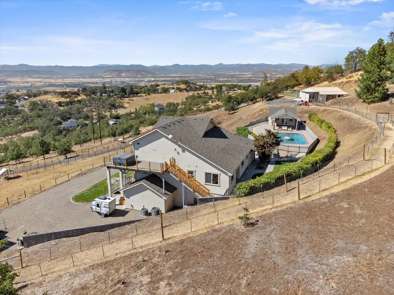 VIEWS VIEWS VIEWS! This private, gated East Medford home offers 4,022 sqft of main home living with breathtaking sunsets and panoramic vistas. The 3-bed, 4-bath with additional office layout is an entertainer's dream. A large balcony and spacious covered patio offer room for entertaining. The 2-car garage and additional RV garage feature vaulted ceilings for abundant storage options. Inside, discover elegant hardwood floors, tray ceilings, and a chef's kitchen with pantry, double ovens, and stainless-steel appliances. The owner's suite is a sanctuary with huge west-facing windows showcasing stunning Rogue Valley views, a private balcony, climate control, hot tub, large fireplace, sauna, and built-in wall safe. Step outside to find a swimming pool with large island, 2 fire pits, plus separate 400 sqft 1 bed, 1 full bath ADU, a barn, spacious workshop, and multiple sheds. Fenced and cross-fenced, making it turnkey for livestock or horses. The land is also fire defensible space managed.