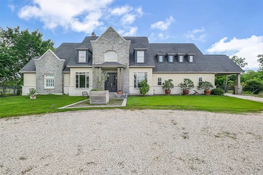 Discover this stunning custom-built home set on a spacious acreage. From the moment you step inside, you're greeted by soaring ceilings and rich wood beams that add warmth and character throughout the home. Every detail has been thoughtfully designed, with custom cabinetry in every room, blending functionality with timeless craftsmanship. The expansive open floor plan offers seamless flow, ideal for both everyday living and entertaining. Step outside to a covered porch perfect for relaxing evenings, or take a dip in the sparkling pool for the ultimate in outdoor living. A detached garage apartment provides flexible space ideal for guests, extended family, or a private office. The porte cochere adds convenience making arrivals and departures effortless. This one-of-a-kind property offers the best of country living with luxurious finishes and custom touches throughout. . Located minutes away from 288 and the beltway, 26 minutes to downtown Houston.
