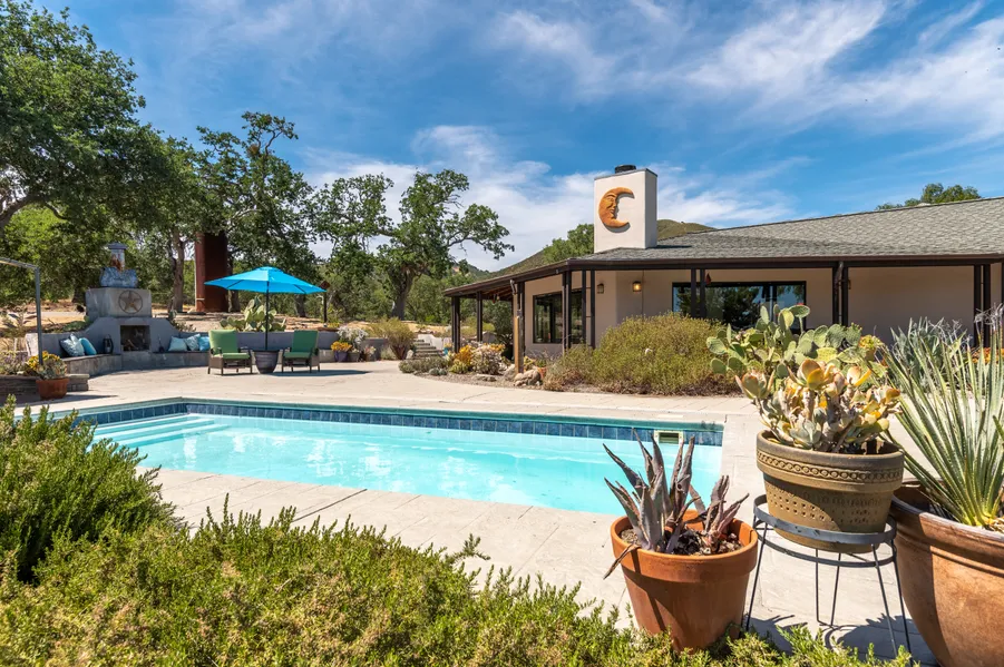 Upper Carmel Valley contemporary country retreat complete with swimming pool on 10.7 tranquil acres, this spacious single-level home and its surrounding grounds offer pure style and comfort with stunning Ventana Wilderness views. Open floor plan features vaulted beamed ceilings and stained concrete floors, surrounding picture windows and glass doors bring natures beauty and light indoors at every turn. Fabulous, cantilevered living room fireplace. Kitchen boasts Viking gas stove, large island with breakfast bar and opens to dining area. Private master suite wing. 2 more bedrooms and 2nd bath, laundry room, mud room, air conditioning, spacious garage. Outdoor spaces enjoy expansive patio with pool, fireplace, canopied dining area, stargazing deck, fenced backyard shaded by grand oak. 2 greenhouses, 1 with aquaponics. Large barn plus 3 open bays, hen house, treehouse. Productive well, water catchment system, 2 water storage tanks, seasonal pond. Horse ready. Carmel Unified School Dist!