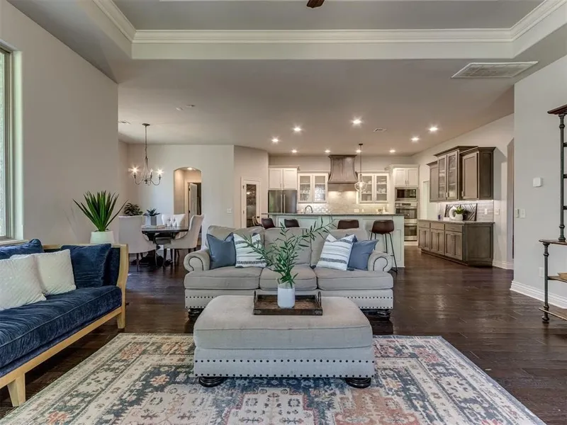 Impeccably designed and thoughtfully laid out, this 6 (could be 7!) bedroom home offers both function and luxury in one of Mustang schools' most sought-after neighborhoods. The main level centers around a stunning kitchen with a large island and generous bar seating, stainless steel appliances, double ovens, and a mix of rich stained and crisp white cabinetry that provide warmth and contrast. A spacious mud bench and walk-through laundry conveniently connect to the primary suite’s oversized closet, complete with its own dressing bench and changing area. The primary suite features a spa-like bath with a freestanding soaking tub, dual vanities, and two separate closets for maximum organization. The open living area showcases wood floors and a stone fireplace, while the first-floor theater room adds the perfect space for movie nights or game days. Three additional downstairs bedrooms include a Jack-and-Jill bath and a separate full hall bath for guests. Upstairs, you’ll find a bonus room, a true fifth and sixth bedroom, and a full bath—ideal for guests, teens, or a home office. A walk-out attic offers abundant storage. Outdoors, enjoy a spacious covered patio, mature trees, full gutters, and a beautifully sized lot. With a blend of elegant finishes and thoughtful functionality, this home has space for every season of life.