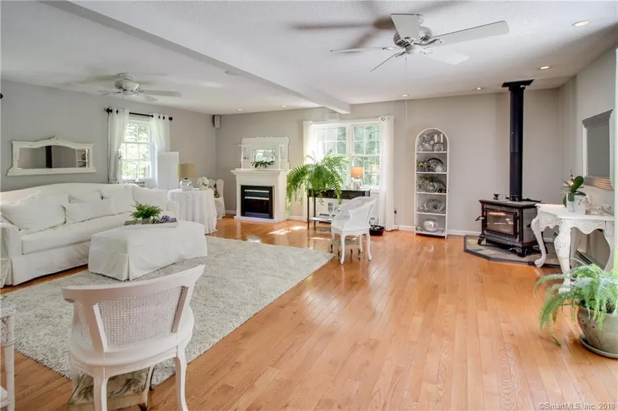 Four bedroom (could possibly be 5) impressive Colonial home with professionally landscaped flower gardens on 1.68 private acres in Saw Mill Hill Estates. Oversized 22x33 family room with private entrance and separate heating could be mother in law quarters. Sliders lead out to deck with a view. Heat efficient Soapstone fireplace, surround sound, French doors, baseboard heat, closets and lots of windows with stunning views. Eat in kitchen with double oven, formal dining room, den plus formal living room with wood burning fireplace. Large Master Bedroom suite with full whirlpool bath and walk in closet. Walk-in attic off master bedroom could be finished for additional space. Rheostats, custom lighting and ceiling fans throughout the house. New hot water heater, water softener and garbage disposal. Great home for entertaining. Soapstone fireplace and wood burning fireplace make this house easy to heat while providing ambiance and an alternative heating source.
