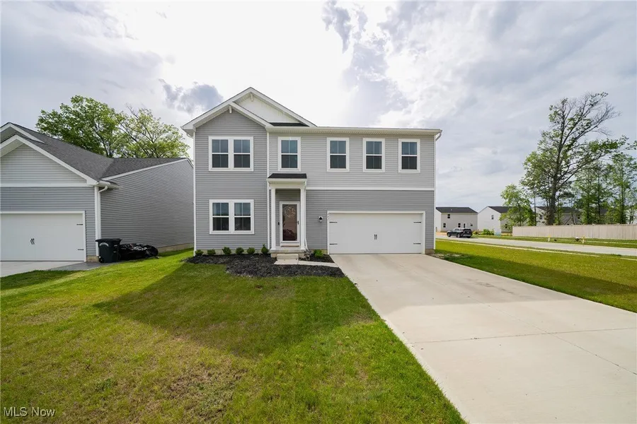 Looking for New Construction Without the Wait? Welcome home to Harvest Meadows in Elyria! Presenting the Water Lily design by K. Hovnanian, completed in late 2023-this immaculate 2,480+ sq. ft. home is a must-see! Offering 5 bedrooms, 2.5 bathrooms, and a spacious open-concept first floor that includes a first-floor bedroom, this layout is perfect for modern living. The gourmet kitchen features granite countertops, 42" cabinets with a stylish mix of white uppers and gray lowers accented by black hardware, a large eat-in island, and a casual dining area with oversized windows that bathe the space in natural light. The home showcases the upgraded Farmhouse Designer Package, including beautiful luxury vinyl plank flooring throughout the first floor, bathrooms, and common areas. Upstairs, you'll find three generous bedrooms, a versatile loft space, a convenient second-floor laundry area, and a luxurious owner's suite with a spacious walk-in closet and a private spa-style bath featuring dual sinks and a walk-in shower. The home is filled with natural light, thanks to thoughtfully placed windows throughout. The full basement includes a 3-piece rough-in and sump pump-ready for your finishing touches and interior design vision. Situated on a large corner lot, this property provides ample outdoor space for entertaining, future deck construction, and all your landscaping dreams. Located near Midview Schools with easy access to Lorain, Avon, Route 20, and Route 10/I-480, you'll enjoy the convenience of suburban life with connectivity to surrounding areas. A home warranty is included for added peace of mind. Don't miss your chance-schedule your private showing today!