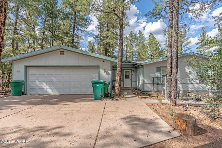 Nestled on 1.11 acres of tall Ponderosa Pines, this remodeled home offers peaceful mountain living with the conveniences of being in city limits. This 3 bedroom, 2 bath home features an open-concept floor plan with the family room and living room connected by a two sided fireplace. The kitchen, offers updated finishes and plenty of room for cooking and gathering. Attached is a two-car garage with a sink. And, a 30x60 RV garage, -with power, insulation, heating and concrete floor-is ideal to be used as a workshop or to plug in the RV! Step outside to a generous covered deck that faces the pines, perfect to enjoy the forest surroundings. AZ room has a pellet stove for cold mornings. Also comes with a back up generator and generator plug to power the main house in case of a power outage.