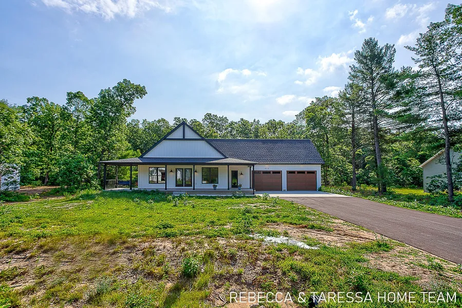 Now under construction, this popular Pembrook design offers an inviting blend of style and comfort. A massive front porch-includes the porch swing-welcomes you through an impressive double-door entry into a bright, open-concept living, dining, & kitchen area highlighted by vaulted ceilings, exposed beams, and abundant natural light. The kitchen is a standout with a large center island topped with quartz, a sleek range hood, and spacious walk-in pantry. The primary ensuite features a walk-in closet, beautifully tiled shower, and thoughtful finishes. The finished daylight lower level includes a cozy built-in reading nook, adding extra charm and functionality, a large family room & 2 additional bedrooms. Extras include an oversized garage, gutters, a full kitchen appliance package, a fireplace and all the bells and whistles you have come to expect with Jeff Miedema Homes, set on a generous .81-acre lot in the serene Peregrine Woods community on Muskegon's NE side. Only a few sites left