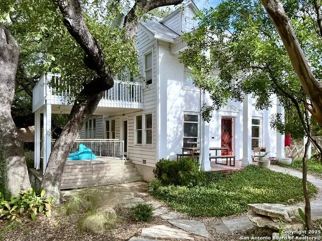 Rich with character, this 1930s gem is nestled beneath a canopy of majestic live oaks on a prominent corner in San Antonio's Monte Vista Historic District. Seamlessly immersed in its natural surroundings yet located in the heart of the city, the home sits adjacent to the gorgeous, park-like campus of Trinity University and overlooks Lang Field-an expansive green space with shaded groves and playing fields. This rare corner lot is densely and rustically landscaped with low-water, low-maintenance plantings, creating a peacefully hidden nature retreat that feels far removed from the bustle-yet it's just minutes from Fort Sam Houston, the Pearl District, Brackenridge Park, Olmos Basin, the University of the Incarnate Word, and downtown. With four bedrooms-plus a versatile third-floor guest suite or office-the home offers flexibility for family life, guests, and remote work. The sunken den is pre-wired for surround sound and projector TV, ideal for a home cinema. Covered porches and an upstairs balcony offer intimate views into the surrounding tree canopy, with sightlines extending to the downtown skyline. The architect-led renovation preserved the home's historic integrity while introducing modern comforts: a renovated kitchen with Bosch appliances and gas range, a water softener, and an instant hot water heater. The result is a home that feels timeless, elegant, and supremely livable. Residents enjoy walkable access to Landa Library and Trinity University's Olympic swimming pool (available via Trinity Outdoor Club membership), as well as the university's world-class public lectures, performances, and cultural events right across the street. This is not just a house-it's a sanctuary of nature, architecture, and urban convenience, waiting to welcome you home.