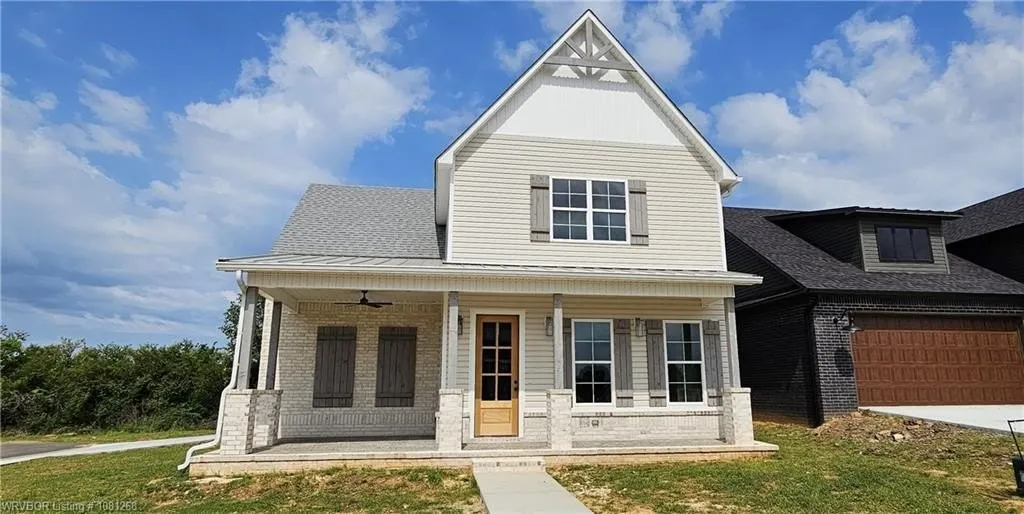 Modern farmhouse design sitting on a corner lot meets spacious living in this 2,309 square-foot, two-story custom-built home. Four bedrooms and 3 1/2 baths provide ample space for family and guests. A great front porch and two-car garage blend functionality with classic farmhouse charm. Main floor features wood floors, 10’ ceilings, 8’ doors, open layout with the living room, dining and kitchen flowing seamlessly together. Built-in cabinets flank the fireplace, offering storage and display space. Enjoy a complete gourmet kitchen with soft close drawers and doors, under counter lighting, stainless appliances (fridge included), a walk-in pantry, serving island with extra storage, and access to the covered back porch. The master suite is located on the 1st floor and the closet doubles as a safe-room. Upper-level floor plan showcases 3 bedrooms, 2 bath’s, walk-in closets, and a walk-out covered balcony. The house is complete with foam insulation and it allows for ample attic storage with walk-in access. Additional highlights include stamped concrete, covered front and back porches, walk-in pantry, oversized two-car garage with 8’ doors, and 6” gutters all around.