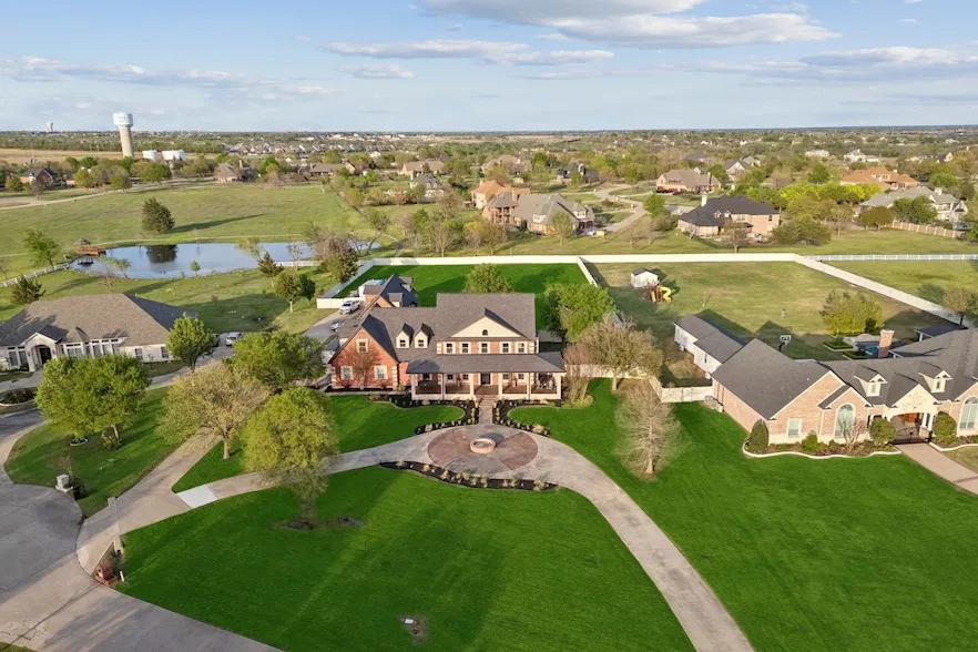 Refined Texas Elegance Meets Luxurious Functionality! Step into a world where sophisticated design & upscale versatility converge in this exquisite 7,000+ sq ft custom estate, crafted for luxurious living & seamless multi-generational comfort. Nestled on a peaceful 1.7-acre cul-de-sac with mature trees & a fully fenced backyard, this property offers privacy & prestige. The main residence features 5 spacious bedrooms, each with ample closet space, 3 full bathrooms, 2 half baths, & thoughtful storage throughout. From the moment you arrive, the home makes a statement: a stately front door, circular drive, & wraparound porch framed by lush landscaping exude warm Texas charm. Inside, dramatic stone columns, soaring ceilings, hand-scraped wood floors, & a grand staircase create a striking first impression. The gourmet kitchen is a dream for any culinary enthusiast, with double ovens, custom cabinetry, built-in wine storage, & a large island with views of the indoor & outdoor living areas. Designed for daily living & entertaining, the home includes a butler s pantry, separate service entrance, & formal & casual dining spaces with panoramic backyard views. The primary suite is a serene sanctuary with vaulted ceilings, exposed beams, a cozy fireplace, & private patio access. The attached spa-inspired bath features a soaking tub, oversized shower, dual vanities, & refined finishes. A secondary suite provides privacy & comfort with a walk-in closet, en suite bath, & patio access ideal for guests or multigenerational living. Upstairs offers 3 bedrooms, a private office, a game room, & media room for work, play, & relaxation. The detached 2-bed, 2-bath guest house has a full kitchen, laundry, living area, garage, & separate utilities perfect for guests, in-laws, or rental income. Outdoor amenities include a resort-style pool & spa, swim-up bar, fire pit, kitchen, & covered patio for entertaining under the stars. This is more than a home it s a legacy in the making.