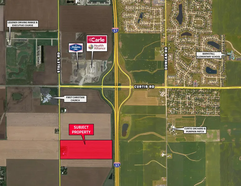 This parcel is prime for immediate or future development on the SW side of Champaign. +/- 56.04 acres are available on South Staley Road less that 1/2 mile from the rapidly expanding Curtis Road Interchange off of I-57. This is the third property south of Curtis Road on the east side of Staley. This property is priced with development in mind, but should you wish to farm it, it has outstanding soil productivity indexes in excess of 143.50. Current tenant has lease in place for 2019 crop year.