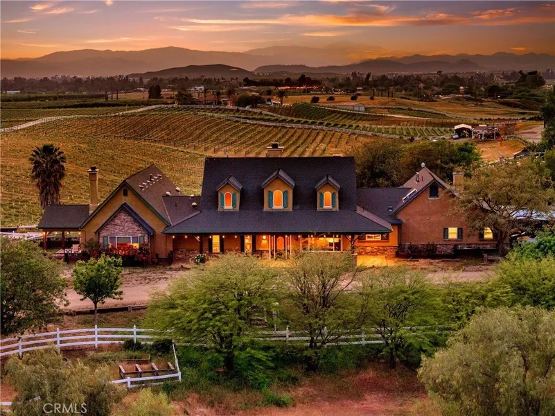 Welcome to Peppertree Lane Ranch, a rare 7-acre vineyard-wrapped retreat where privacy, luxury, and effortless indoor/outdoor living come together. Morning hot-air balloons drift overhead; evenings bring quiet sunsets over the vines. Three turnkey residences, resort-style amenities, and extensive equestrian facilities create a setting unlike anything else in Temecula Valley Wine Country. THE MAIN RESIDENCE (4bd/4ba) blends custom stone, wood, and ironwork with true SoCal indoor/outdoor living. A chef’s kitchen with Viking appliances and oversized island opens to an accordion-glass wall for seamless entertaining. Enjoy a pool and spa framed by vineyard views, a spa-style primary suite with covered patio, a second master suite with its own turfed lawn, and a three-car garage. THE COTTAGE (2bd/2ba) near the property entrance offers its own garage, grill area, hammock, bocce court, and picnic space – perfect for guests or weekend getaways. THE VILLA building provides four individually keyed king suites with a shared lobby, each with custom stone grotto showers. The adjoining recreation area includes grills, picnic tables, fire pit, and bocce court.*** Horse lovers will appreciate 15 Stalls with covers, very well built, varying sizes w/a minimum of 18’ x 20’, 60' round pen, a lighted arena (225’ x 125’)with sound and covered seating, and privately gated access to miles of vineyard trails.*** Plenty of room for vineyards, farm animals, organic gardens, fruit trees or recreation areas.*** Smart-enabled access, mesh WiFi throughout, and exceptional multi-use potential – personal estate, family compound, equestrian center, boutique hospitality, wellness retreat, or creative hideaway. Offered unfurnished; furnishings available.** This property MUST BE EXPERIENCED IN PERSON to appreciate its setting, craftsmanship, and versatility; schedule a tour today.