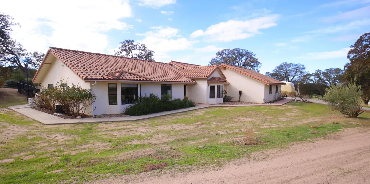 Beautiful spacious ranch home on 13+/- acres with the luxury of a custom pool and spa. Relax and entertain in the outdoors under the huge covered patio area. The flat to rolling land is perfect for farming, horses, or cattle - completely fenced. Century oak trees dot the landscape, and the high point has views of neighboring vineyards. Close to town yet surrounded by much larger parcels for privacy, peace and quiet. The home has 3 bedrooms and a large office which could be a 4th bedroom. There are 3 bathrooms. The fireplace insert heats the entire home, and you'll never have to buy firewood! There is even an extra deep 3-car garage. Come enjoy the peaceful country lifestyle. Be sure to see the Virtual Tour with many more photos!