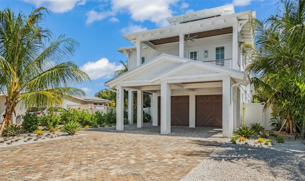 This recently constructed home on Anna Maria Island overlooking a stunning canal is just one block from the pristine Gulf of Mexico beaches and a short walk to the restaurants and boutiques on Pine Ave. This luxurious 5-bedroom, 5.5 bath retreat offers a spectacular backyard with a private pool and swim up bar, in-ground spa, a covered shellcrete patio with seating, a ping pong table, and a BBQ grill. The coastal home features two garages and a private drive accommodating four vehicles. The main living floor has an open layout with bright natural lighting, a plush living area with sofas and a TV. The kitchen is equipped with upgraded stainless steel Bosch appliances and quartz countertops. There are many dining areas including the cozy kitchen nook, kitchen island, formal dining room, or on the balcony overlooking the canal. The 5 beautifully designed bedrooms feature elegant decor, chic furnishings, bedside lighting, and ensuite bathrooms. The second floor houses 3 bedrooms with king beds and full baths, a half bathroom for guest use, and a walk-in laundry room with a washer and dryer. The third floor includes a seating area with a table and chairs, a TV area, a wet bar, and two primary suites accessible by elevator or stairs. These suites feature king beds, private terraces, walk-in closets, and ensuite bathrooms with large glass-walled showers. Additionally, the rooftop deck provides an ideal spot for relaxation and taking in the views. This home offers a blend of luxury, comfort, and convenience, making it an exceptional choice for your Anna Maria Island life!!