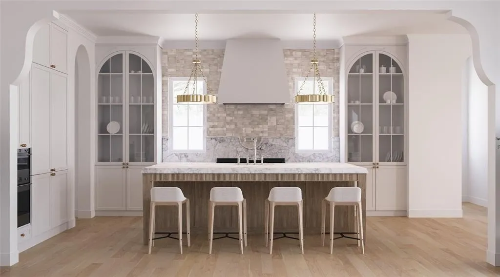 The timeless façade, defined by light brick, arched entryways, and classic symmetry, sets the tone for the sophisticated interiors within. Inside, soaring ceilings, expansive windows, and an open-concept layout create a light-filled environment perfect for everyday living and entertaining.