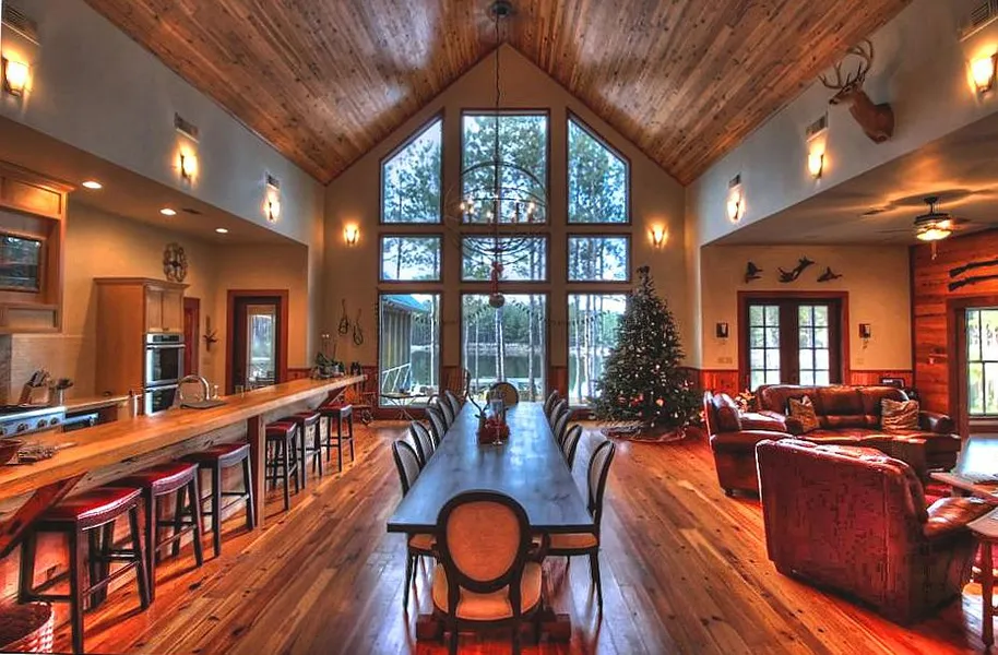 Lodging: Completely custom 6,000 sq/ft lodge situated on a peninsula overlooking a 10 acre private lake. Home features 2 master suites in the main house with a 4ba/4ba bunk house separated by a covered dog trot. Custom finishes include reclaimed heart pine flooring throughout, soaring cypress ceilings in the great room, Thermador stainless appliances, granite countertops, custom gun room, and so much more! Exterior features include stone accents mined from the Cumberland Mountains in TN. Around back there is screen porch and patio for entertaining guests, in addition to a custom fire-pit overlooking the lake. The lake has been well managed by Slade's Fish Hatchery and regularly produces 8-10lb trophy bass.