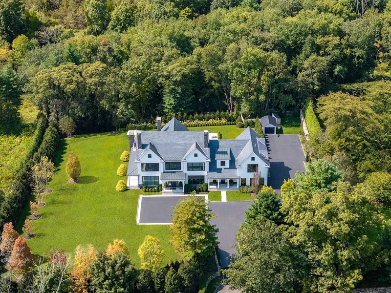 Sophisticated, high-end 2023 construction with pool on 2.6 gated acres. This custom 7 bdrm/8 bath transitional-style home with western exposure offers contemporary spaces enhanced by 10-11 foot ceilings & wide-plank, white oak flooring. Designer gourmet kitchen adjoins sunny breakfast/dining room and family room. Exquisite primary suite with fireplace and private deck. Superb 500+ sq. ft. finished closet space in attic. Walk-out lower level with gym, 7th en-suite bdrm, professional recording studio, Pilates room with built-in makeup/hair station, 2nd family room & 2nd laundry room. Sunset views from covered porch with outdoor fireplace and overhead heaters. Terrace with awning-covered dining area & barbecue overlooks secluded, private backyard. Magnificent 50x20' jetted saltwater pool.