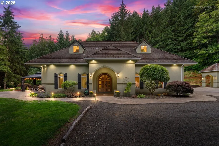 Welcome to 40811 NW Linklater Rd, North Plains, OR - a private Tuscan-inspired retreat set on two forested parcels with Whiskey Creek and Trickle Creek winding through. Enjoy groomed trails for walking, riding, or quads, with room to expand. A timber deferral offers potential marketable timber (buyer to verify). Outdoor amenities include an above-ground pool, full-yard irrigation, a large garden with irrigation, stunning paver patio with firepit, and a covered RV pad with its own patio. In addition, this property offers direct creek access with a designated picnic and camping area, perfect for relaxing or overnight stays immersed in nature. The 5-bed, 4-bath home features radiant and in-floor heating, a high-producing well, septic, and main-level living with two primary suites. Upstairs offers two bedrooms, a shared bath with tiled walk-in shower, and a spacious common area. A detached 3-car garage provides ample storage and includes a bonus room with half bath and separate electric meter-ideal as a workshop, guest suite, or hangout. A rare opportunity to own a peaceful, self-sufficient sanctuary where nature and comfort meet. Note: Two parcels are sold together one being R2092325 which the home sits on at 5.0 acres and the other R2092324 which is 11.11 acres . HOME IS MOVE IN READY.