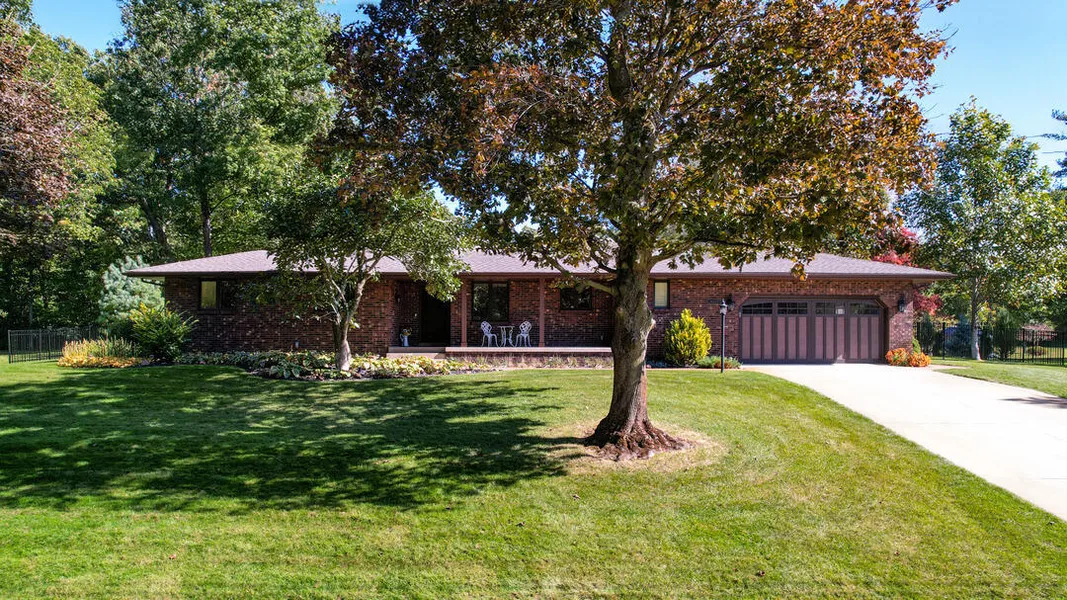 Impeccable All-Brick Ranch with Modern Updates! This meticulously maintained 3-bedroom, 2.5-bath ranch is a true standout, offering both comfort and style. A welcoming covered front porch sets the stage for this exceptional home. Inside, the inviting living room showcases a beautiful floor-to-ceiling stone gas fireplace, creating a warm and elegant ambiance. The spacious primary bedroom features a renovated ensuite bathroom, complete with a walk-in tile shower. Convenient main-floor laundry adds to the home's everyday functionality. The full, dry basement is mostly finished and features a wet bar area and cozy gas stove making it ideal for entertaining, creating a recreation area, or expanding your living space. Plus, there's ample storage! The oversized, heated 2-car garage provides plenty of space, while the perfectly landscaped yard is effortlessly maintained with an irrigation system. Step through the sliding glass doors into your peaceful backyard retreat, complete with a stamped concrete patio, charming swing, and custom-built bar--perfect for relaxing or gathering with friends and family. Adding even more charm and functionality, an 18x12 shed--straight out of a magazine--complements the outdoor space beautifully. Recent updates within the past five years include a new roof, whole-house Generac generator, wrought iron fence, garage door, quartz countertops, stainless steel appliances, luxury vinyl flooring, primary bathroom renovation, updated lighting fixtures, new water softener, pressure tanks and pump for the 4" well, and fresh paint throughout. Don't miss out on this move-in-ready beauty--schedule your showing today!