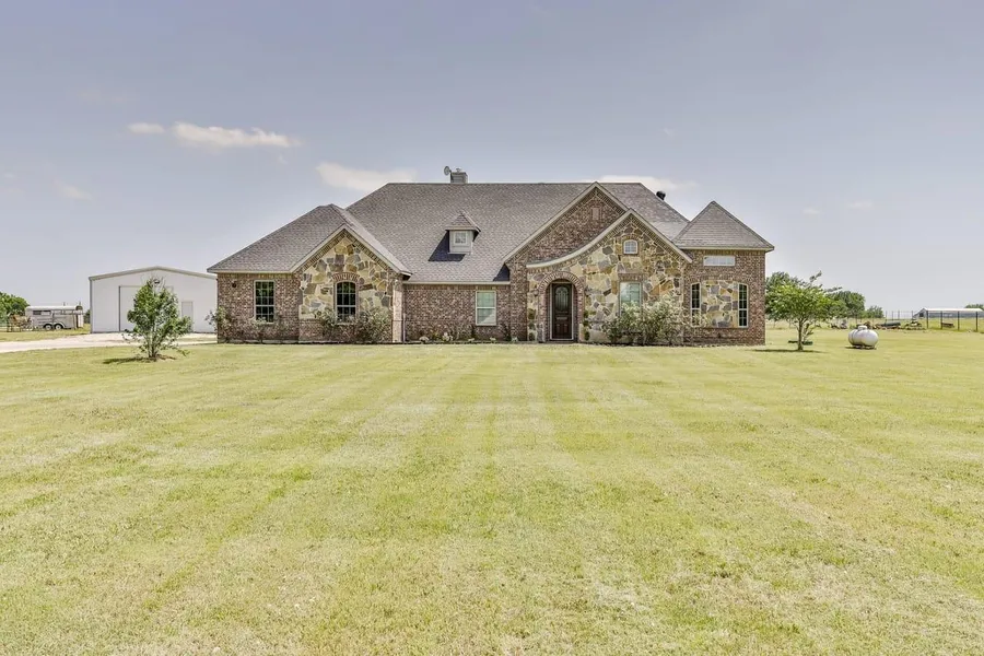 Gorgeous custom home on 4.5 Acres, with barn. Large living room with cut stone and brick floor-to-ceiling fireplace, with cedar mantle and corbels. Open floorplan with custom features throughout. Four bedrooms, three full bathrooms, plus French doors leading to your new office or studio. The whole house is light and bright, with warm accents of natural wood, stone, designer tiles, and beautiful countertops. Inviting kitchen with gas cooktop, accent backsplashes, island with eating area and sink. Stainless steel double ovens and upgraded microwave. Walk-in pantry with designer glass door. Large laundry room centrally located, with sink. Master bedroom with jetted designer tub, oversized shower, and separate vanities. . Awesome covered back porch with outdoor fireplace.