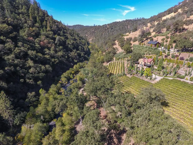 Hidden away in the Sierra Nevada foothills near the historic town of Placerville is an Italian-style villa with vineyard, orchards and over a thousand feet of the beautiful, slate lined Consumnes River. This remarkable property consists of 41 acres, a spectacular 2,850 square foot home with three bedrooms, three baths, a large barn-style building that features guest quarters, a gym and more.