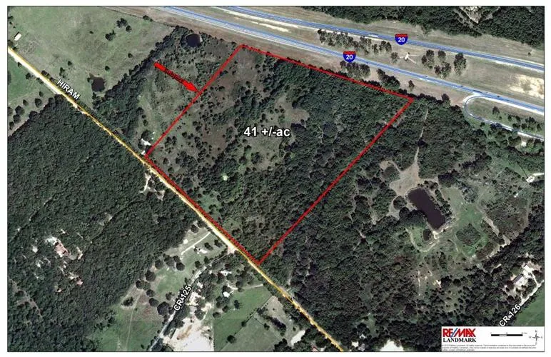 41 Acres only 40 miles East of Dallas on Interstate 20 & fronting Hiram Rd. Excellent commercial site or residential homesite. Very nice homes along Hiram Road. Site is heavily treed and nice rolling terrain.