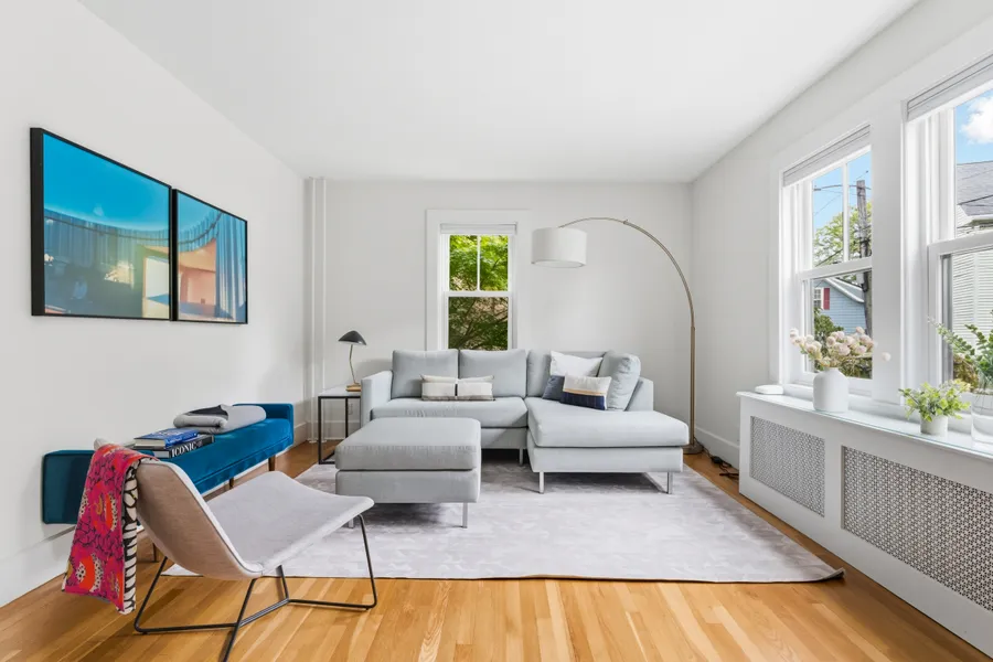 Near Arnold Arboretum, a three-plus bed, two bath single family and one bed, one bath apartment with parking, blocks to Forest Hills T. Of 1880s vintage and tucked on a gentle hill, its secluded fourth-story deck faces the arboretum. The main house features three levels. The first floor greets with a large living room and semi-open kitchen and dining room. The kitchen, with dining peninsula and extensive storage, opens to a covered deck. The second floor offers two sizable bedrooms, one with an adjacent office or studio, and a clawfoot tub bath. A pass-through room leads to an expansive skylit top-floor primary suite with dressing room, double-vanity bath, and private deck. On the rear garden level, the 375 square foot one-bedroom apartment has patio entry. Bluestone wraps the rear and side yard, leading up to the driveway with EV charger. On a one-way block in Jamaica Plain’s Arborway area, just 0.2 miles to the arboretum and short blocks to the bookstore, bakeries and cafes of Centre-South Streets.