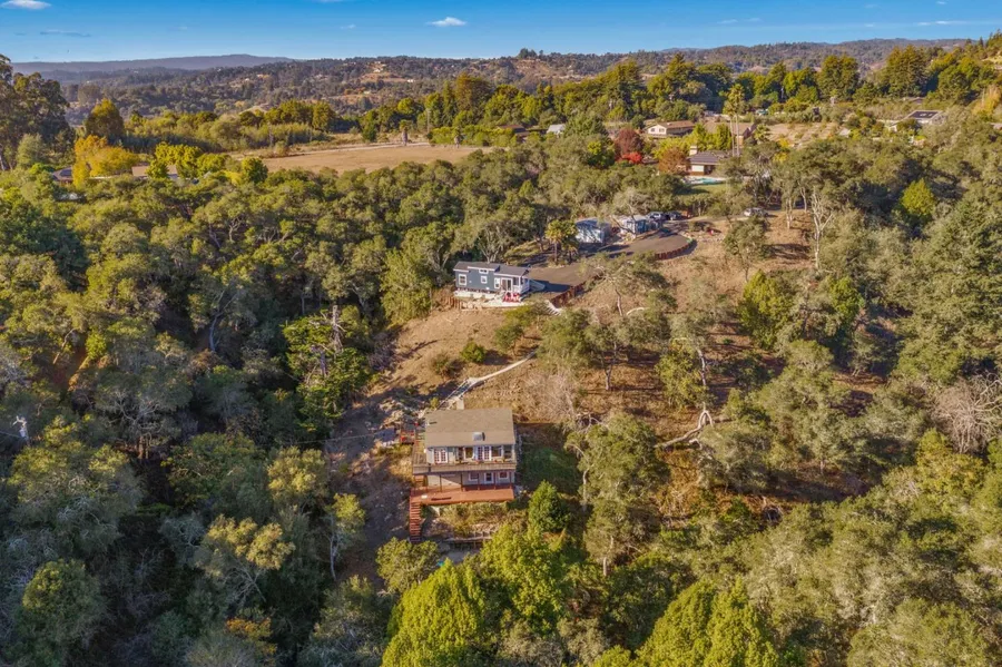Idyllic country setting at this close-in Soquel location with Ocean Views! Sun drenched 2.5 acres with end of driveway privacy yet just minutes to beaches, shopping, highway, and schools. You will fall in love with this charming property with so much potential for a family compound, room for gardening, hobbies, animals . . . Primary home is a vintage cabin built in 1936 with vaulted ceilings, wood burning fireplace, sunny dining room, 2 large decks. There is a tiny home parked at the top of the property which would be an ideal spot for building a new home or additional dwelling unit. Tons of room for parking as well as 2 car garage with a 'She Shed' adjacent.