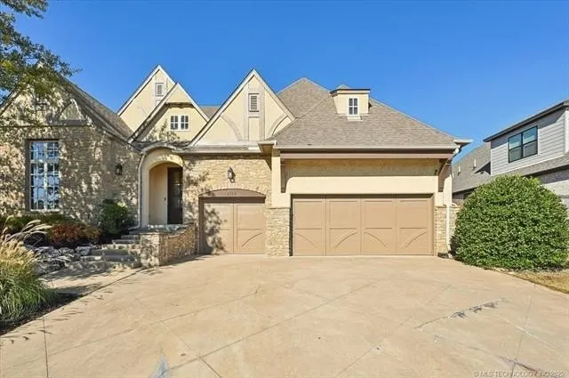 Fabulous French styled stucco and stone home in desirable Southern Trails! This home boasts an outdoor oasis with refreshing pool, relaxing hot tub, two covered patios, one with added fireplace for cozy evenings. Grand two story entry opens to great room with stone fireplace, wood beam ceiling accents, built in shelves, wet & dry bar and open kitchen with granite island, double ovens and cooktop. Executive vaulted office and formal dining room. First floor primary ensuite with oversized spa like bath and large walk in closet. Second bedroom downstairs with private bath. Second floor offers large game room with separate home theatre, ideal for entertaining. Two additional bedrooms with pullman bath. Each have large walk in closets. Three car garage with lots of storage and built in cabinets. Easy access to Creek Turnpike and close to Cedar Ridge Country Club.