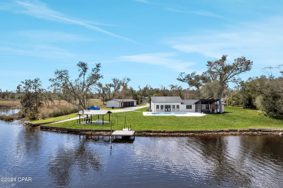 Welcome to your dream lakefront oasis! This completely remodeled 4 bedroom/3 bathroom home is over 2,000 square feet and sits on just over an acre with almost 250 feet of water frontage! The home has been completely remodeled and features a new metal roof, luxury vinyl plank flooring, new A/C, new water heater, waterfall quartz countertops and new black stainless steel appliances in the kitchen, new pool equipment, and 2 fireplaces, one wood burning in the living room and one electric out on the screened in porch. The main bedroom has expansive lake views with french doors out to the pool, a custom walk-in closet, and a luxurious spa like bathroom with shower and soaking tub. There are beautiful lake views from almost every room in the house! The property features a detached 3 car garage, a pool, a screened in porch, and a pavilion by the lake, perfect for entertaining guests. With your very own dock, boat ramp, and extra paved parking for a boat or RV, indulge in endless days of fishing, boating, and water sports right from your doorstep. The property is located on the East side of Deer Point Lake, just 3 minutes from McCall Everett Park public boat ramp where you can launch your boat on the opposite side of the dam and head to North Bay and the gulf. The brand new Publix supermarket is minutes away right off HWY 231. You don't want to miss this super unique property! All Information is deemed to be reliable, but is not guaranteed, buyer to verify if important.