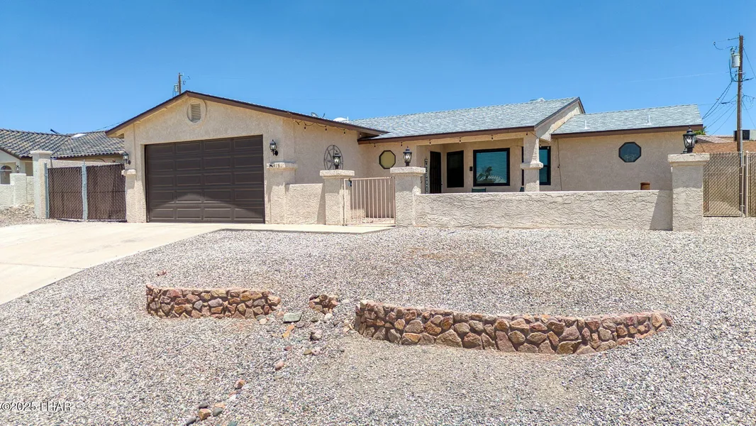 Nicely updated home in the heart of Lake Havasu City. Elevated lot allows for lake views from the front! Split bedroom plan, featuring 2 primary suites. Central living area featuring plank flooring, kitchen offers granite countertops, stainless appliances and loads of natural light. Boat deep garage and extra side parking too! Rear covered patio, and E-Z care landscaping in both the front and rear. New roof in 2021, new windows in 2022. Call your Realtor to see this turn-key home!
