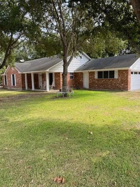 Charming brick home in Flatonia - this 1596 sq.ft. three bedroom, two bath home has been updated with fresh paint and attractive vinyl plank flooring for ease of care and features plantation wooden shades on the windows throughout. The spacious living area connects with the dining room as well as the kitchen. The kitchen is bright and cheerful with lots of cabinets and white appliances and lighting. The primary bedroom is large enough for a king size bed, if desired; and the second and third bedrooms are a generous size as well. The hallways and bedroom doors are wheelchair accessible. The garage offers enough room for two vehicles plus space for the washer and dryer. Trees shade the deck in the backyard and the backyard is completely fenced with privacy fencing on the street side.