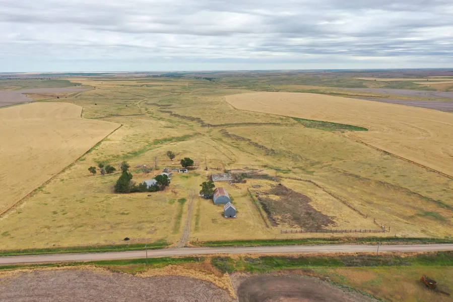 Old uninhabitable home on property. Old grain bins and quonset. Well and electric.