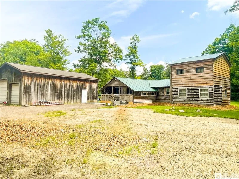 Here is your chance to own a home with acreage in the country; conveniently located between Fredonia and Jamestown. This secluded 2 bedroom home features a large 40x24 garage with 12 sidewalls and two bays 8 and 10, a workshop, and insulated ceilings. A pond sits out back in the middle of this 2+ acres property. The property is mostly mowed, secluded from the road and neighbors. The house has a covered porch leading into an eat in kitchen which over looks into the large living room. There is currently a small half wall in the living room that can be removed upon request. Off the living room is a large hallway leading to a big utility room, a back door (currently closed off), a small bedroom, and very large bathroom (The bedroom and bath were recently gutted and remodeled). Leading upstairs is a another very large bedroom with a deep closet. Many updates have been made to the home including a 200 amp electrical service,all new pex, water heater, 5 year old roof; as well as, a lot of outside clearing and grading. This house is located in the highly sought after Cassadaga Valley school district. Property, garage, and home are being sold AS IS. Playset stays with the property.