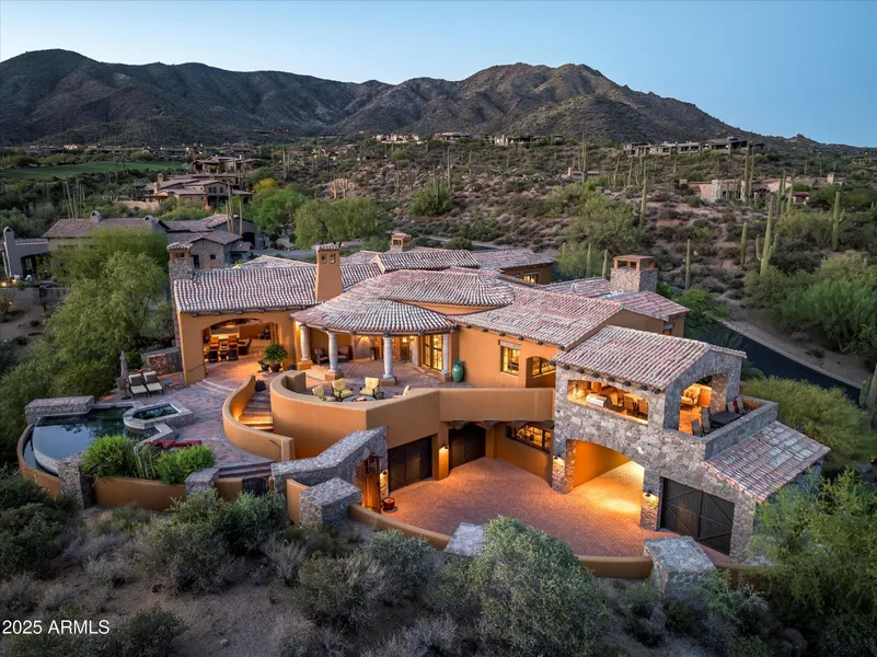 DESERT MOUNTAIN GOLF MEMBERSHIP AVAILABLE. Embrace a casual yet elegant resort lifestyle in the stunning Mediterranean hillside home in Village of Saguaro Forest within the prestigious guard-gated Desert Mountain Club in North Scottsdale, AZ. This home showcases the Lee Hutchison design with a floor plan that perfectly accommodates entertaining and family living in & out. The great room welcomes you to a gorgeous stone wall & Cantera fireplace, vaulted beamed ceilings and inviting bar. A raised grand dining room overlooks living room and valley views beyond. Chef's Kitchen and cozy Hearth room offer panoramic mountain & city views. Primary suite has its own private patio with fireplace. Game/Media Room can be 5th Bedroom w/en-suite bath. Pristine craftsmanship throughout.
