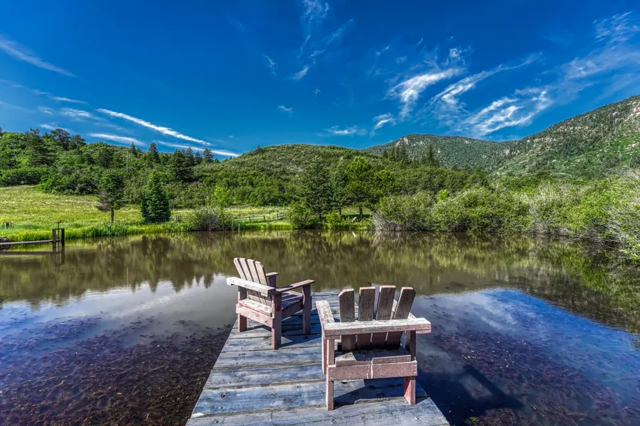Join the Green Mountain Ranch Estates Community and enjoy life on a pond—Experience Colorado’s finest country living, where horse-friendly zoning allows you to fully embrace the equestrian lifestyle. Situated on 8 acres of stunning Colorado countryside, this property invites you to create the custom home of your dreams. The land is graced with mature trees, gently rolling hills, and spectacular mountain views, offering a serene and picturesque setting that feels both private and expansive. The pastoral beauty of this landscape provides a perfect backdrop for a peaceful retreat, a lively gathering place, or a haven for horses, ready to fulfill your every aspiration. The private pond is perfect for launching a canoe from the dock for a tranquil paddle or simply relaxing by the water’s edge with family and friends. You may even spot colorful Koi fish swimming beneath the surface. The pond and its dock serve as a gathering place for quiet mornings, lively afternoons, and memorable moments. The impressive 1,872 sq ft Barn is a true asset; its durable metal roof and soaring 10-16’ ceilings make it both functional and spacious. It is fully electrified and features four well-designed stalls, each with feeders and cement flooring covered in comfortable rubber matting. The tack room includes a convenient floor drain, and every stall opens to an outdoor pen with water troughs. Beyond its natural beauty and exceptional amenities, this property offers the best of both worlds in terms of location. You’ll enjoy the peace, privacy, and beauty of rural life while remaining just minutes from modern conveniences, the Air Force Academy, and easy access to I-25 for seamless travel throughout the region.