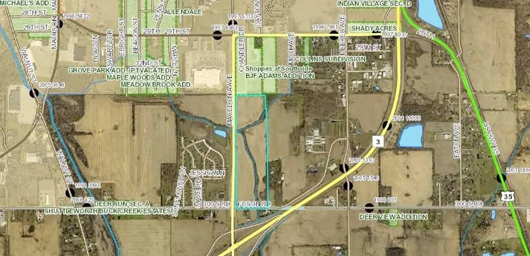 42 Acres of development land along State Road 3 / Macedonia Ave at the entrance to Muncie from the Muncie Bypass and New Castle, Indiana. This property sits across from Walmart and south of the Shoppes at Southside and is ideally suited for future commercial development. Income from Billboard and crops.